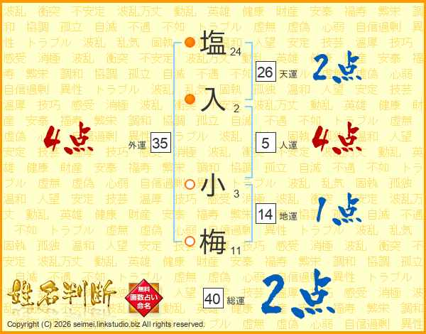 生活面を象徴する運勢です。外部から受ける影響力を表し、結婚運、家庭運や職場、環境への順応性を表します。総運から人運を引いた画数。姓や名が1文字の場合を除く。