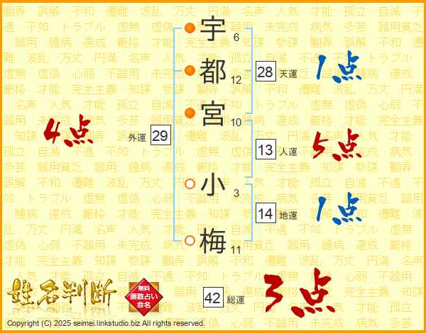 宇(6画)都(12画)宮(10画) 小(3画)梅(11画)