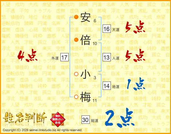 あなたの人生を表す1番重要な運勢です。生涯を通じて影響する総合運となり、主に50歳以降の晩年期に影響を及ぼします。苗字と名前の合計画数。