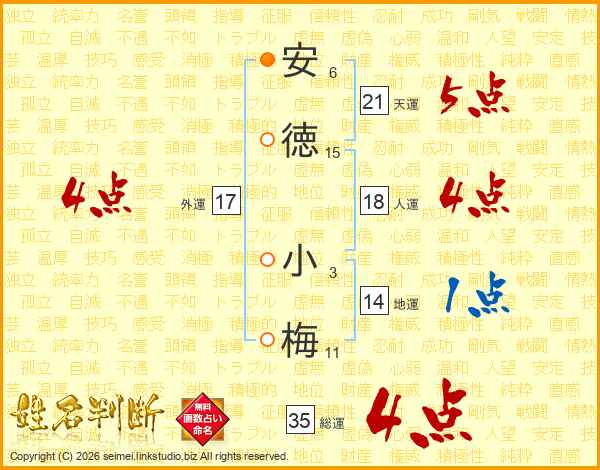 生活面を象徴する運勢です。外部から受ける影響力を表し、結婚運、家庭運や職場、環境への順応性を表します。総運から人運を引いた画数。姓や名が1文字の場合を除く。