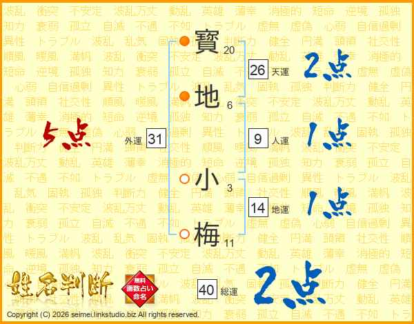 生活面を象徴する運勢です。外部から受ける影響力を表し、結婚運、家庭運や職場、環境への順応性を表します。総運から人運を引いた画数。姓や名が1文字の場合を除く。