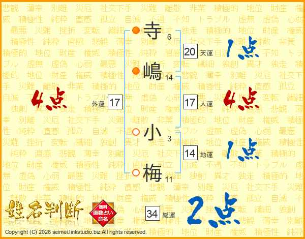 寺(6画)嶋(14画) 小(3画)梅(11画)