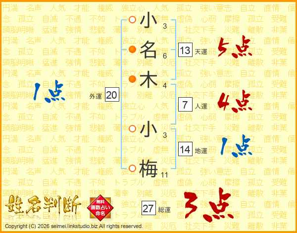 小(3画)名(6画)木(4画) 小(3画)梅(11画)