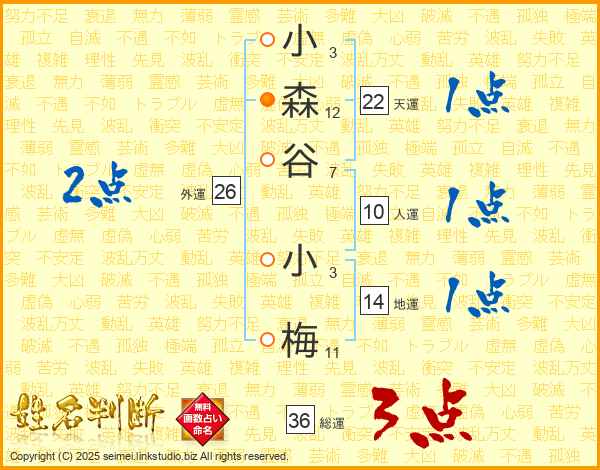 小(3画)森(12画)谷(7画) 小(3画)梅(11画)