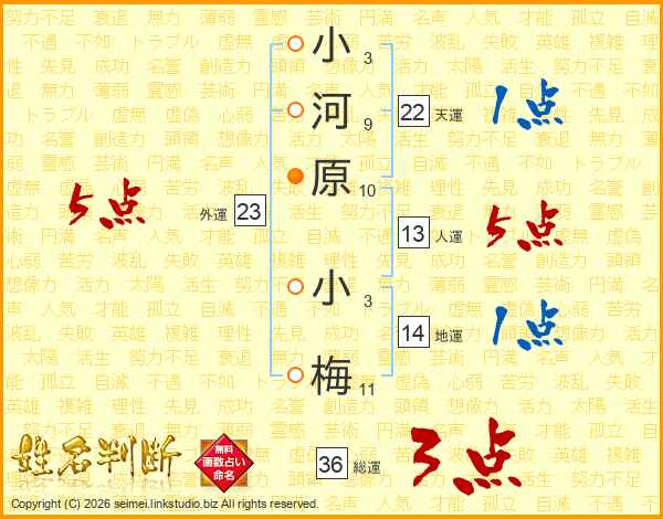 生活面を象徴する運勢です。外部から受ける影響力を表し、結婚運、家庭運や職場、環境への順応性を表します。総運から人運を引いた画数。姓や名が1文字の場合を除く。