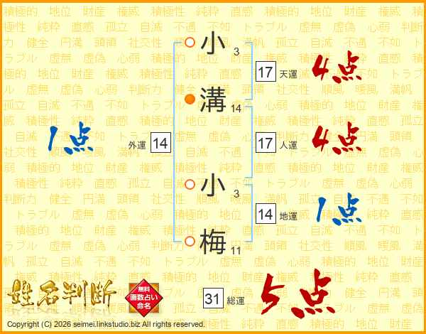 生活面を象徴する運勢です。外部から受ける影響力を表し、結婚運、家庭運や職場、環境への順応性を表します。総運から人運を引いた画数。姓や名が1文字の場合を除く。