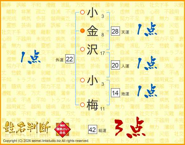 小(3画)金(8画)沢(17画) 小(3画)梅(11画)
