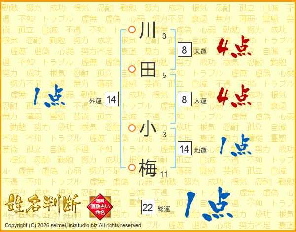 生活面を象徴する運勢です。外部から受ける影響力を表し、結婚運、家庭運や職場、環境への順応性を表します。総運から人運を引いた画数。姓や名が1文字の場合を除く。