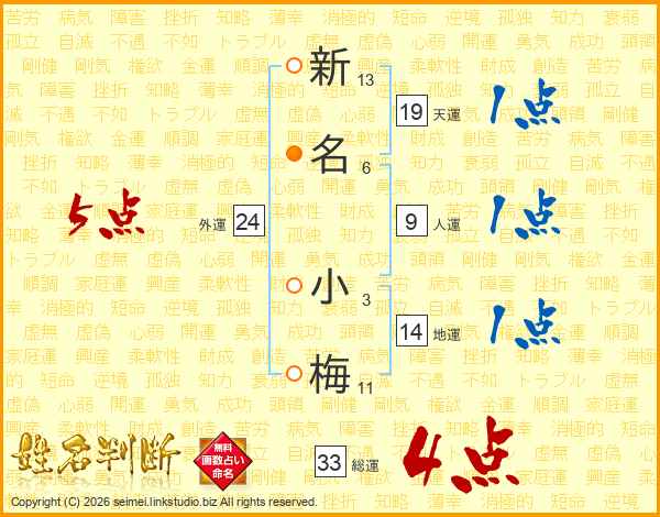 生活面を象徴する運勢です。外部から受ける影響力を表し、結婚運、家庭運や職場、環境への順応性を表します。総運から人運を引いた画数。姓や名が1文字の場合を除く。