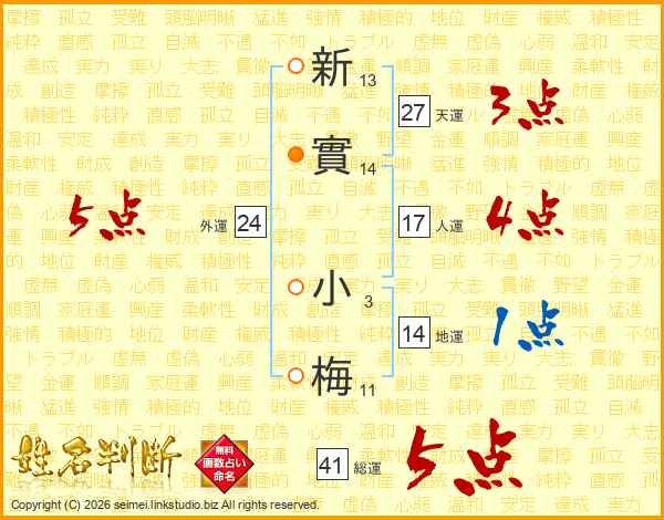 生活面を象徴する運勢です。外部から受ける影響力を表し、結婚運、家庭運や職場、環境への順応性を表します。総運から人運を引いた画数。姓や名が1文字の場合を除く。