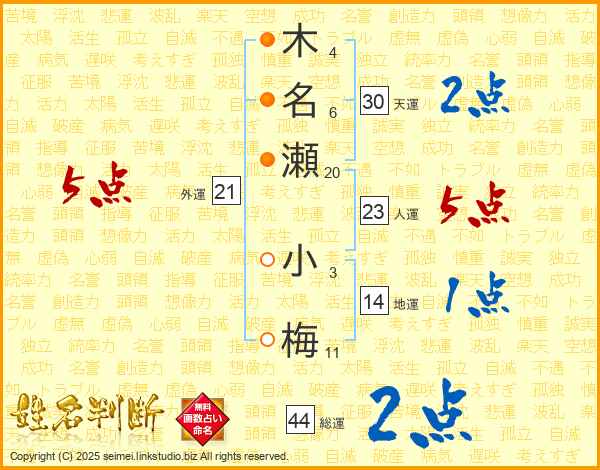 木(4画)名(6画)瀬(20画) 小(3画)梅(11画)