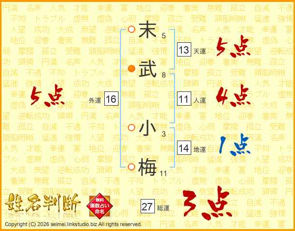 生活面を象徴する運勢です。外部から受ける影響力を表し、結婚運、家庭運や職場、環境への順応性を表します。総運から人運を引いた画数。姓や名が1文字の場合を除く。