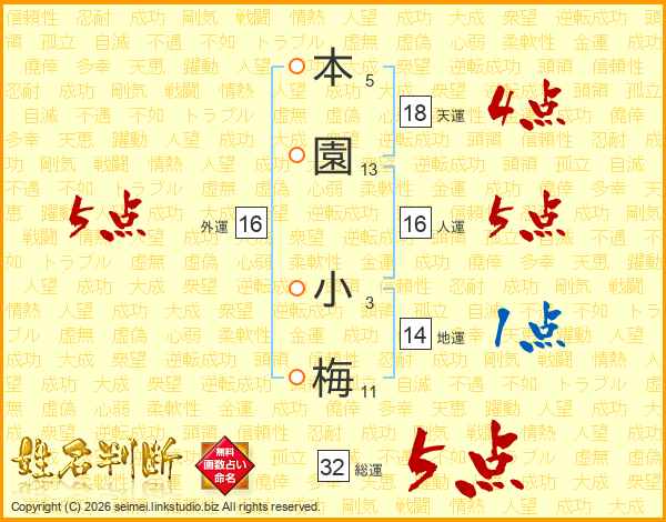 生活面を象徴する運勢です。外部から受ける影響力を表し、結婚運、家庭運や職場、環境への順応性を表します。総運から人運を引いた画数。姓や名が1文字の場合を除く。