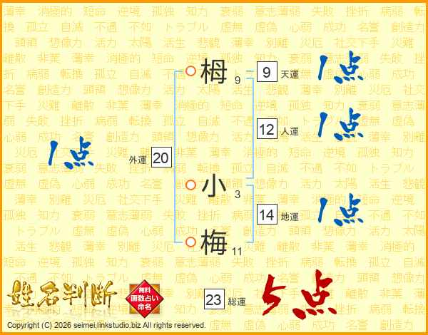生活面を象徴する運勢です。外部から受ける影響力を表し、結婚運、家庭運や職場、環境への順応性を表します。総運から人運を引いた画数。姓や名が1文字の場合を除く。