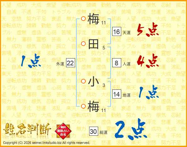 生活面を象徴する運勢です。外部から受ける影響力を表し、結婚運、家庭運や職場、環境への順応性を表します。総運から人運を引いた画数。姓や名が1文字の場合を除く。
