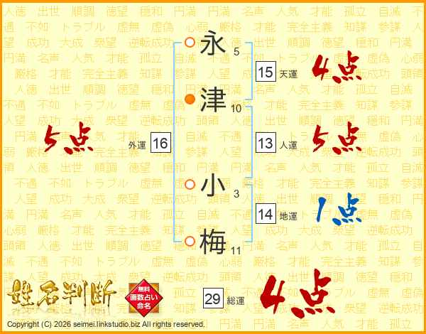 生活面を象徴する運勢です。外部から受ける影響力を表し、結婚運、家庭運や職場、環境への順応性を表します。総運から人運を引いた画数。姓や名が1文字の場合を除く。