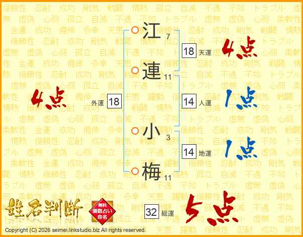 生活面を象徴する運勢です。外部から受ける影響力を表し、結婚運、家庭運や職場、環境への順応性を表します。総運から人運を引いた画数。姓や名が1文字の場合を除く。