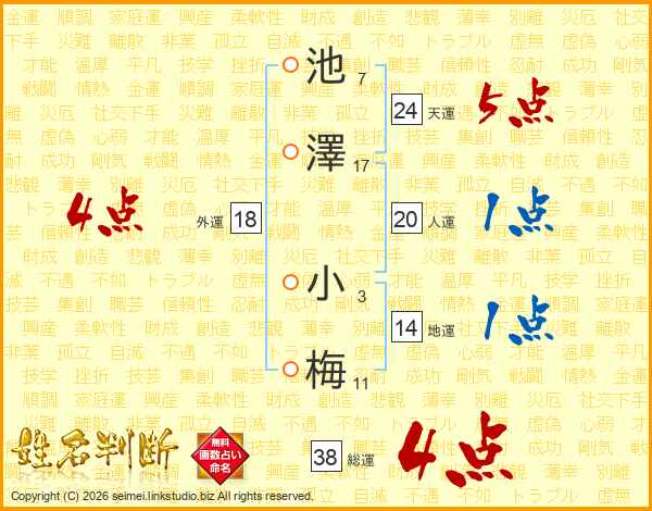 池澤小梅さんの総運は38画の4点!