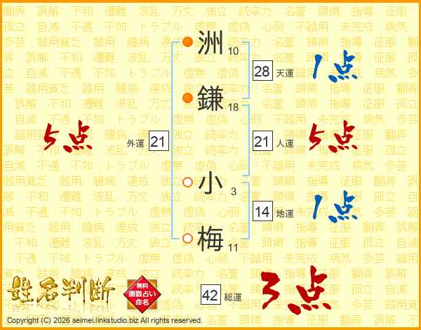 生活面を象徴する運勢です。外部から受ける影響力を表し、結婚運、家庭運や職場、環境への順応性を表します。総運から人運を引いた画数。姓や名が1文字の場合を除く。