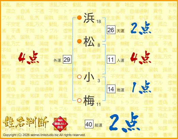 生活面を象徴する運勢です。外部から受ける影響力を表し、結婚運、家庭運や職場、環境への順応性を表します。総運から人運を引いた画数。姓や名が1文字の場合を除く。