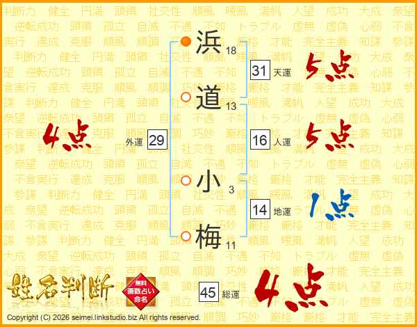 生活面を象徴する運勢です。外部から受ける影響力を表し、結婚運、家庭運や職場、環境への順応性を表します。総運から人運を引いた画数。姓や名が1文字の場合を除く。