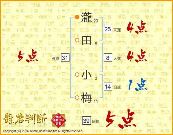 瀧田小梅さんの総運は39画の5点!
