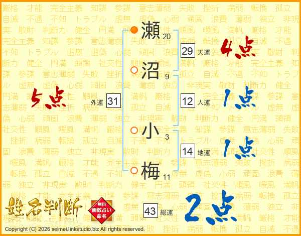瀬(20画)沼(9画) 小(3画)梅(11画)
