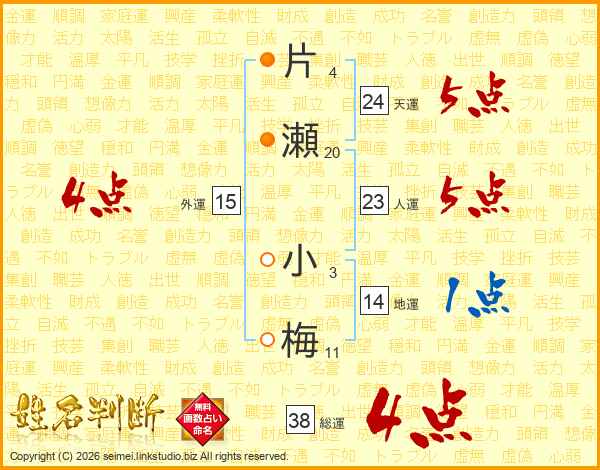 片(4画)瀬(20画) 小(3画)梅(11画)