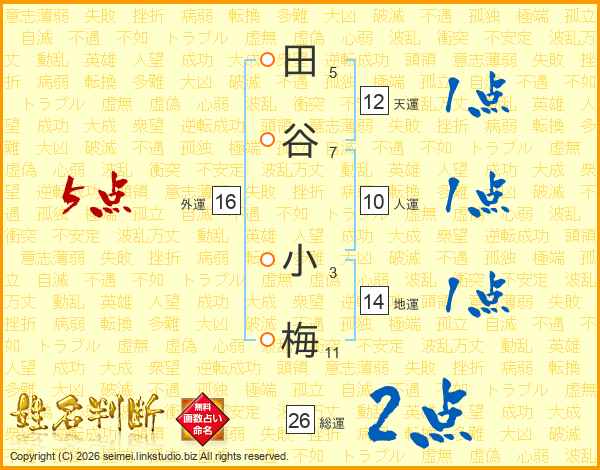 生活面を象徴する運勢です。外部から受ける影響力を表し、結婚運、家庭運や職場、環境への順応性を表します。総運から人運を引いた画数。姓や名が1文字の場合を除く。