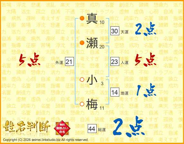 真(10画)瀬(20画) 小(3画)梅(11画)