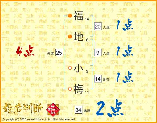 生活面を象徴する運勢です。外部から受ける影響力を表し、結婚運、家庭運や職場、環境への順応性を表します。総運から人運を引いた画数。姓や名が1文字の場合を除く。