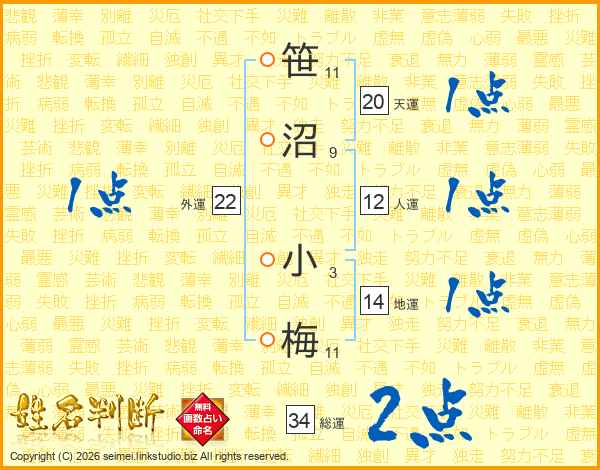 笹(11画)沼(9画) 小(3画)梅(11画)