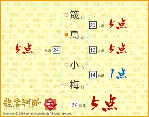 生活面を象徴する運勢です。外部から受ける影響力を表し、結婚運、家庭運や職場、環境への順応性を表します。総運から人運を引いた画数。姓や名が1文字の場合を除く。
