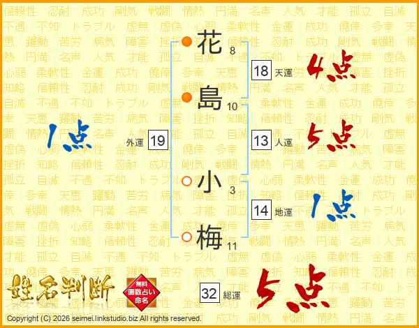 生活面を象徴する運勢です。外部から受ける影響力を表し、結婚運、家庭運や職場、環境への順応性を表します。総運から人運を引いた画数。姓や名が1文字の場合を除く。