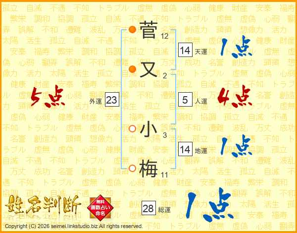 生活面を象徴する運勢です。外部から受ける影響力を表し、結婚運、家庭運や職場、環境への順応性を表します。総運から人運を引いた画数。姓や名が1文字の場合を除く。