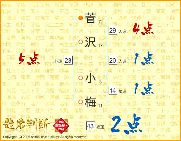 菅沢小梅さんの総運は43画の2点!