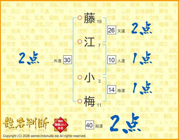 生活面を象徴する運勢です。外部から受ける影響力を表し、結婚運、家庭運や職場、環境への順応性を表します。総運から人運を引いた画数。姓や名が1文字の場合を除く。