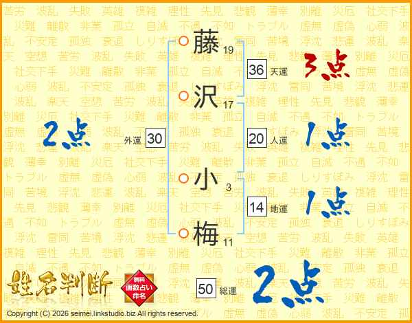 藤(19画)沢(17画) 小(3画)梅(11画)