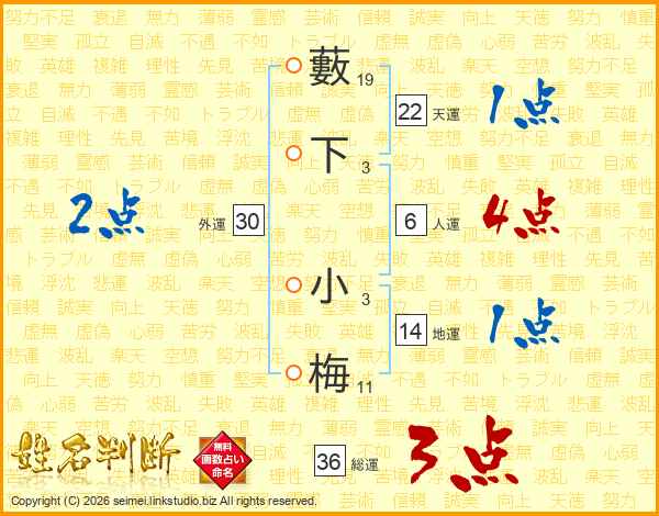 生活面を象徴する運勢です。外部から受ける影響力を表し、結婚運、家庭運や職場、環境への順応性を表します。総運から人運を引いた画数。姓や名が1文字の場合を除く。