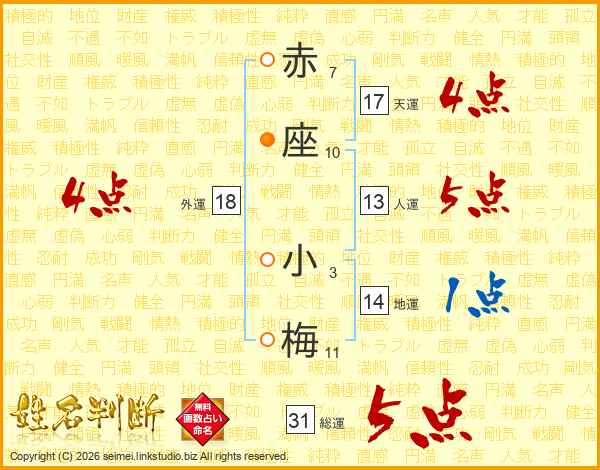 生活面を象徴する運勢です。外部から受ける影響力を表し、結婚運、家庭運や職場、環境への順応性を表します。総運から人運を引いた画数。姓や名が1文字の場合を除く。