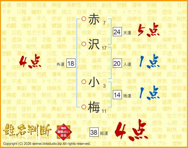 赤(7画)沢(17画) 小(3画)梅(11画)