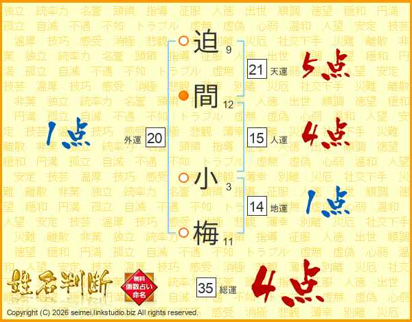 迫間小梅さんの総運は35画の4点!