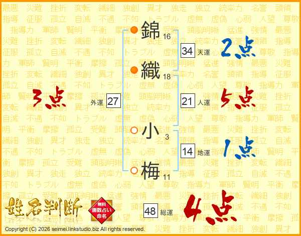 錦(16画)織(18画) 小(3画)梅(11画)