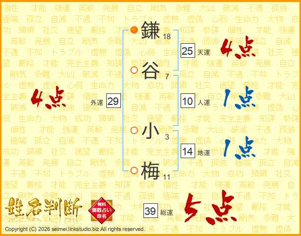 鎌(18画)谷(7画) 小(3画)梅(11画)