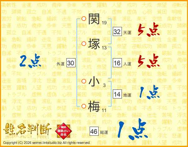 生活面を象徴する運勢です。外部から受ける影響力を表し、結婚運、家庭運や職場、環境への順応性を表します。総運から人運を引いた画数。姓や名が1文字の場合を除く。