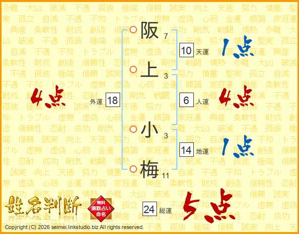 生活面を象徴する運勢です。外部から受ける影響力を表し、結婚運、家庭運や職場、環境への順応性を表します。総運から人運を引いた画数。姓や名が1文字の場合を除く。