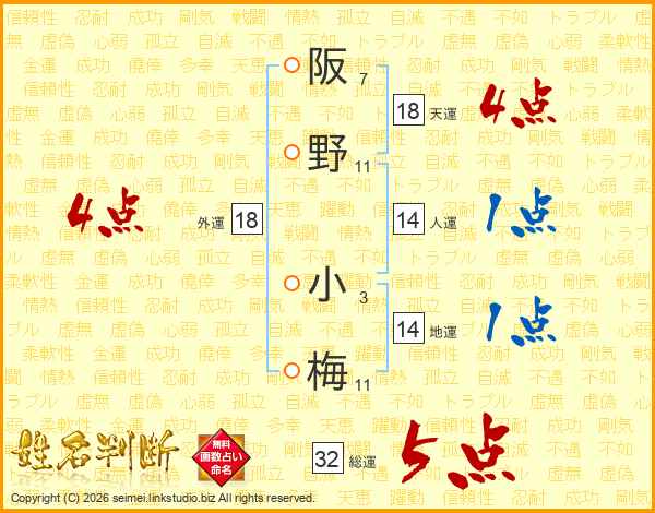 生活面を象徴する運勢です。外部から受ける影響力を表し、結婚運、家庭運や職場、環境への順応性を表します。総運から人運を引いた画数。姓や名が1文字の場合を除く。