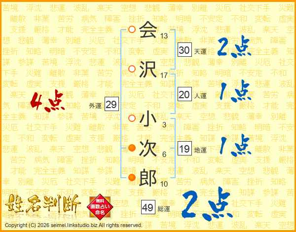 会(13画)沢(17画) 小(3画)次(6画)郎(10画)