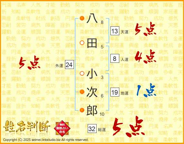 生活面を象徴する運勢です。外部から受ける影響力を表し、結婚運、家庭運や職場、環境への順応性を表します。総運から人運を引いた画数。姓や名が1文字の場合を除く。