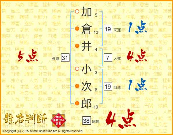 加(5画)倉(10画)井(4画) 小(3画)次(6画)郎(10画)
